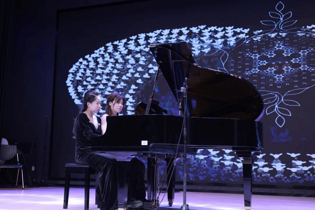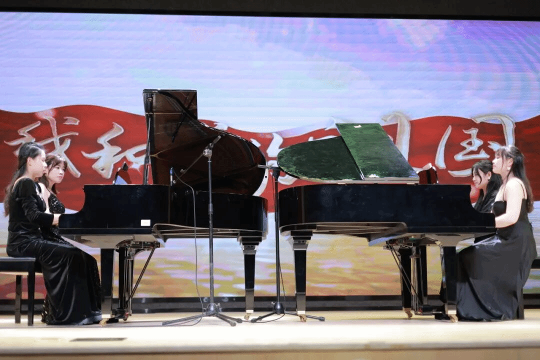 杨子萱、孔杨君、向易菲、王奕歆四位同学带来钢琴八手联弹《我和我的祖国》。八只手在四架钢琴上共同舞动,气势磅礴的旋律在音乐厅中回荡。她们以精湛的技艺,将对祖国的热爱之情融入到每一个音符之中,激昂的节奏让全场观众热血沸腾,心中涌起浓浓的爱国情怀。