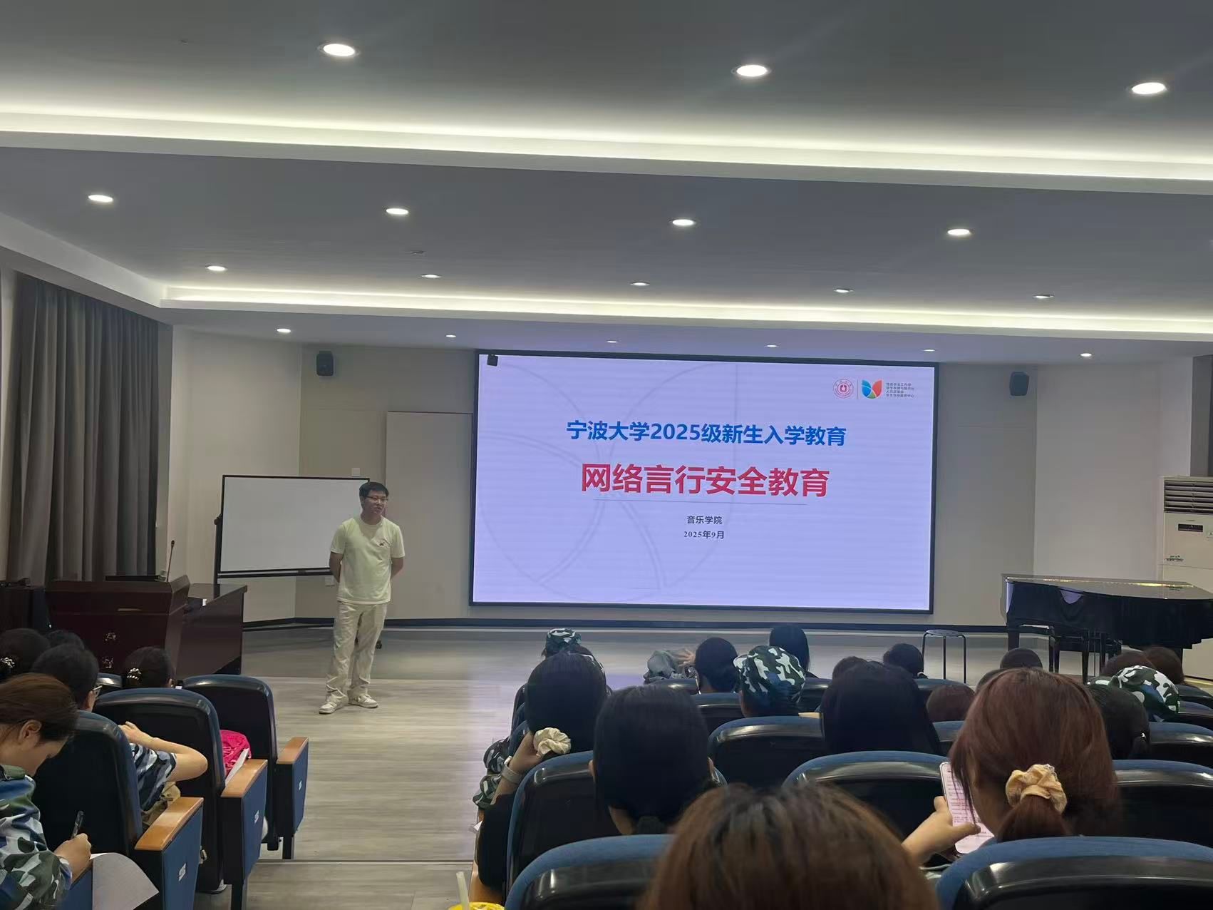 于2025年9月8日下午在学院阶梯一教室组织开展2025级新生网络言行安全专题培训。本次培训由学院学工办主办,学院党政办协办。2025级全体新生及班主任代表共同参与。