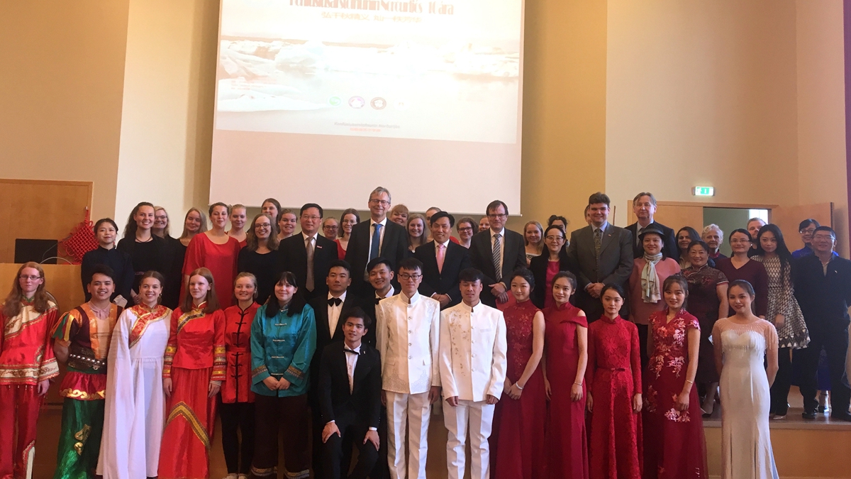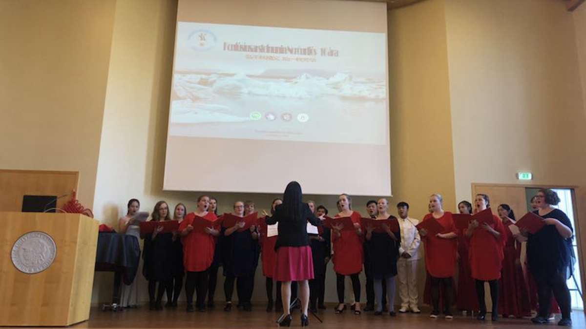 师生赴冰岛参加北极光孔子学院成立十周年院庆典礼。中国驻冰岛大使馆金智健大使,冰岛大学校长尤阿特里,98堂
