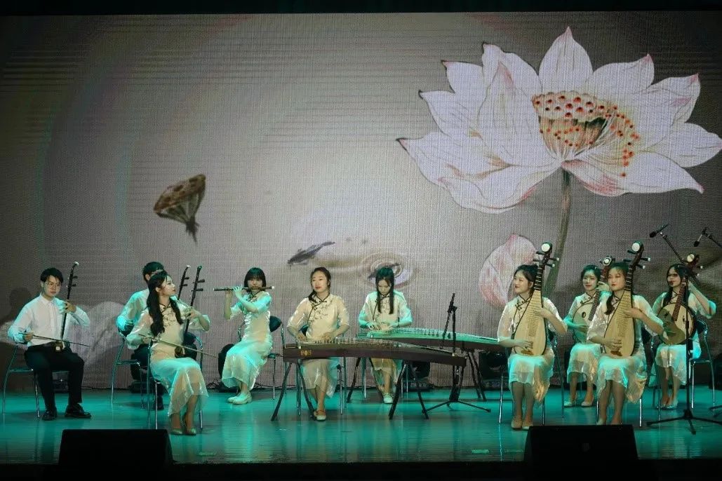 极具江南民间特色的民乐合奏曲《采茶舞曲》 作为晚会的开场。《采茶舞曲》原指江南人民在采茶时所唱的歌曲,后改编成了民乐合奏曲。在水墨画的映衬下,民乐团的同学们更添了几分江南的韵味,将整首曲子演绎的惟妙惟肖。