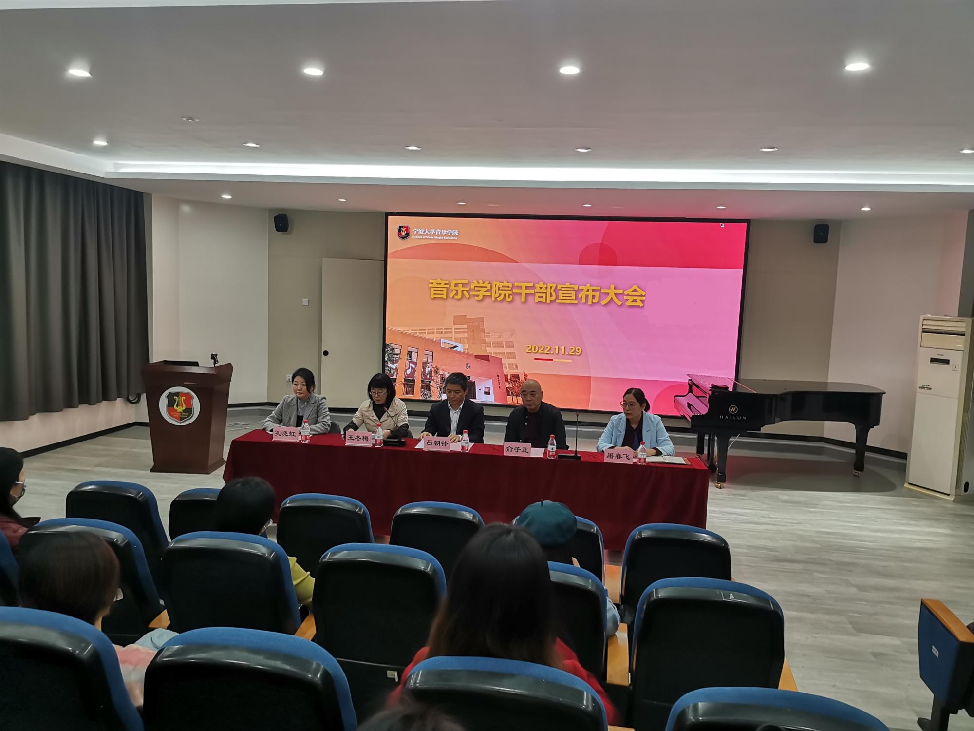 11月29日上午10点30分,音乐学院领导干部宣布大会在逸夫艺术楼一楼阶梯教室召开。学校党委副书记、副校长吕朝锋、组织部原副部长王冬梅出席会议。