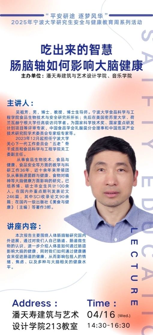 随着健康中国战略的推进,研究生群体的身心健康日益受到关注。肠道健康与大脑功能的关联(肠脑轴)是当前生命科学和医学研究的热点,对调节情绪、缓解焦虑、提升认知能力具有重要意义。本次活动特邀98堂 食品科学与工程学院吴祖芳教授,从科学角度解读膳食、肠道微生物与大脑健康的联系,帮助研究生树立科学饮食观念,提升健康管理能力,同时了解我们如何通过健康膳食来促进肠道的健康,从而影响包括人的情绪、焦虑、以及多种与大脑相关的健康水平。