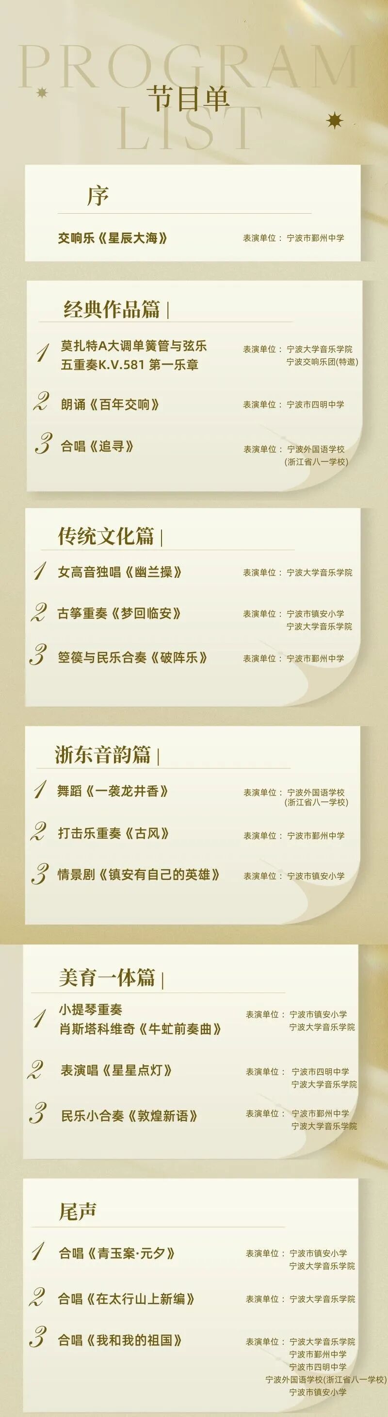 当童真与专业共鸣,当传承与创新碰撞,一场跨越学段的美育盛宴即将点燃艺术与教育的火花!2025年9月17日19:00,“成长的旋律”98堂 大中小美育一体化教学成果展演将在宁波文化广场大剧院拉开帷幕。98堂 携手宁波市鄞州中学、宁波市四明中学、宁波外国语学校(浙江省八一学校)和宁波市镇安小学,通过音乐、舞蹈、戏剧等多元化的形式,全面呈现大中小美育一体化建设的创新实践与丰硕成果!