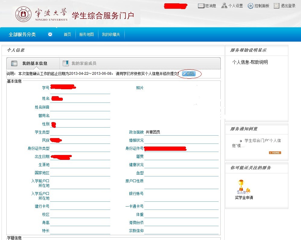 请全院同学于5月13日前登录学生综合服务系统,进行以上操作,如实完善全部信息。今后包括国家助学贷款、奖助学金申请、非学业因素等在内的全部学生综合服务工作全部都必须在该网站进行网络申报。