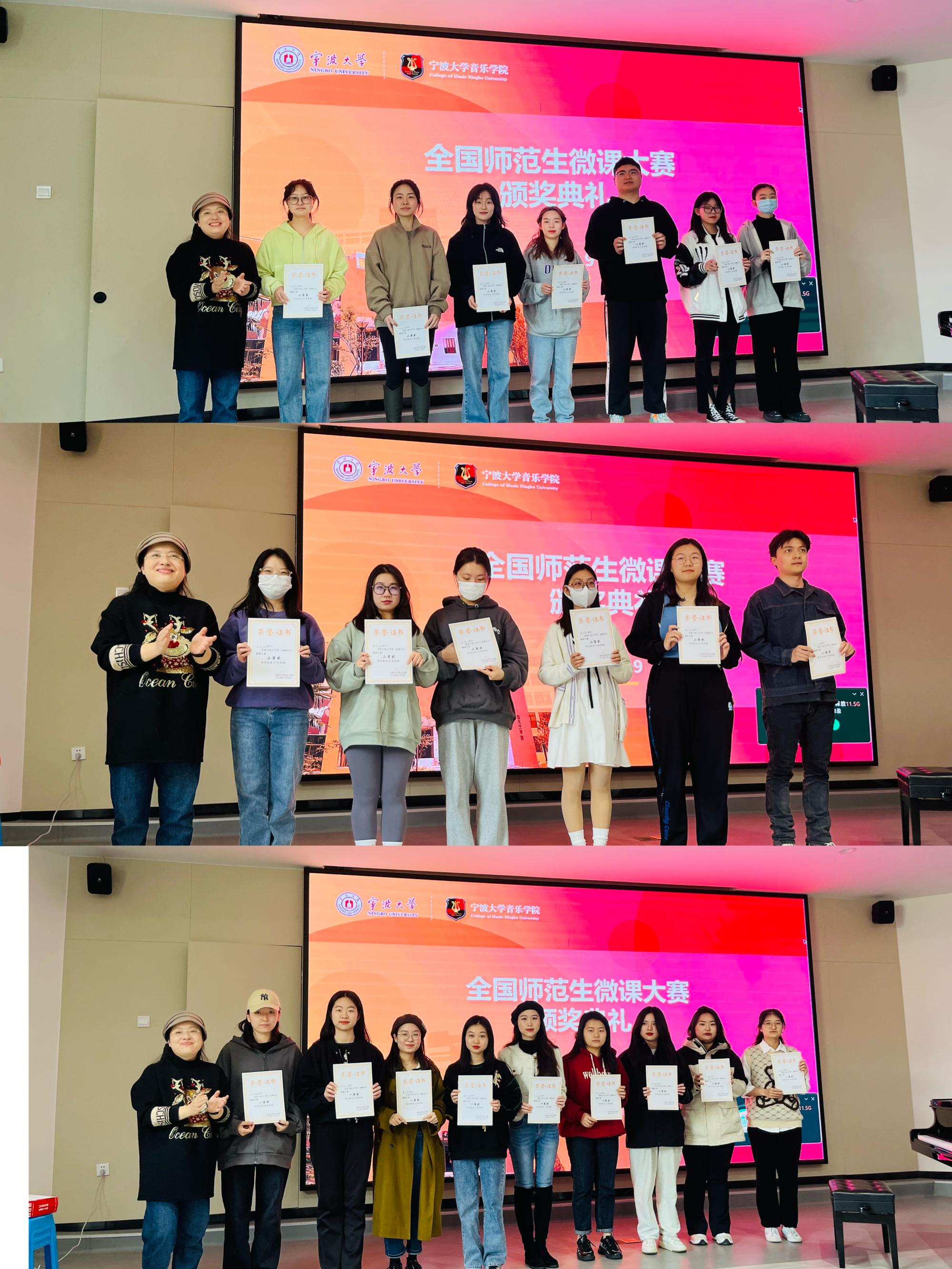 在逸夫音乐楼一楼报告厅举行了全国师范生微课大赛颁奖典礼。副院长王蕾宣读了院级、校级、国家级获奖学生名单,并为获奖学生颁发荣誉证书。