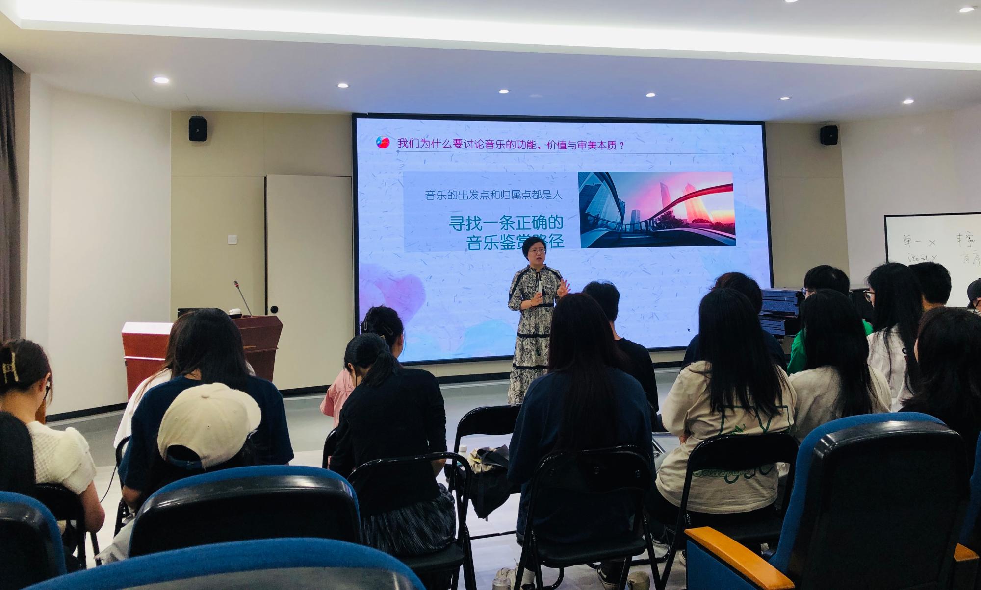 本次公开观摩课的课程名称为《音乐美学基础》,是面向音乐学(师范)专业学生开设的一门专业选修课,观摩课教学主题为音乐的功能、价值、审美本质与音乐艺术现象的复杂性。以对音乐的艺术功能、实用功能;独有审美价值、作为工具的价值及多种价值混合的剖析为出发点,引出音乐作为丰富而有序的感性样式这一审美本质,在此基础上分析当下音乐生存状态的多元特性,尝试以此来回答哲学对音乐的终极本质追问——“音乐是什么”的问题。观摩课充分展现了“产出导向,学生中心”的理念,将抗疫歌曲的音乐功能、流行音乐的时代价值与责任等与学生学习生活息息相关的问题与音乐美学基本原理做深度融合,规避了美育思政的机械灌输,课堂氛围热烈,学生参与度极高,整堂课赢得了学生们和在场观摩老师的一致好评。