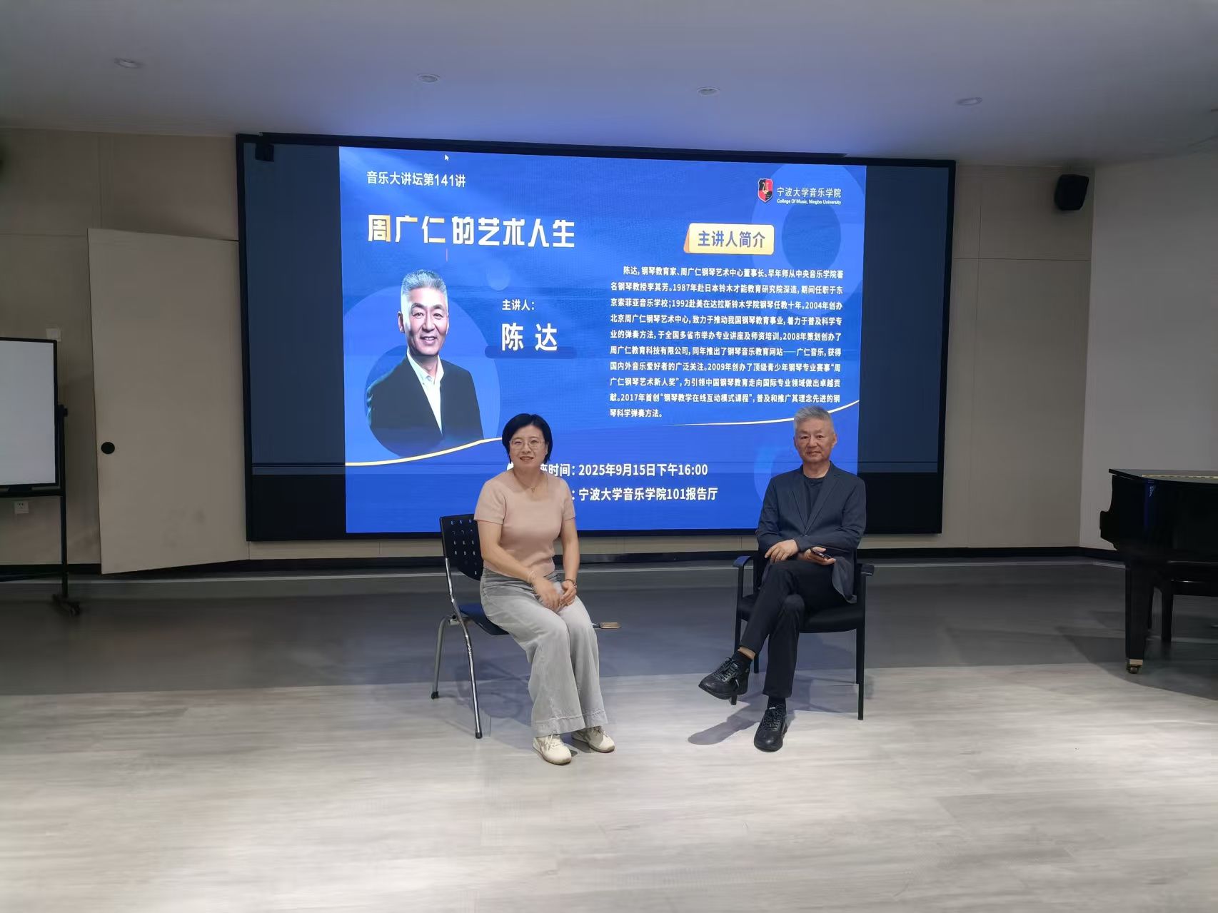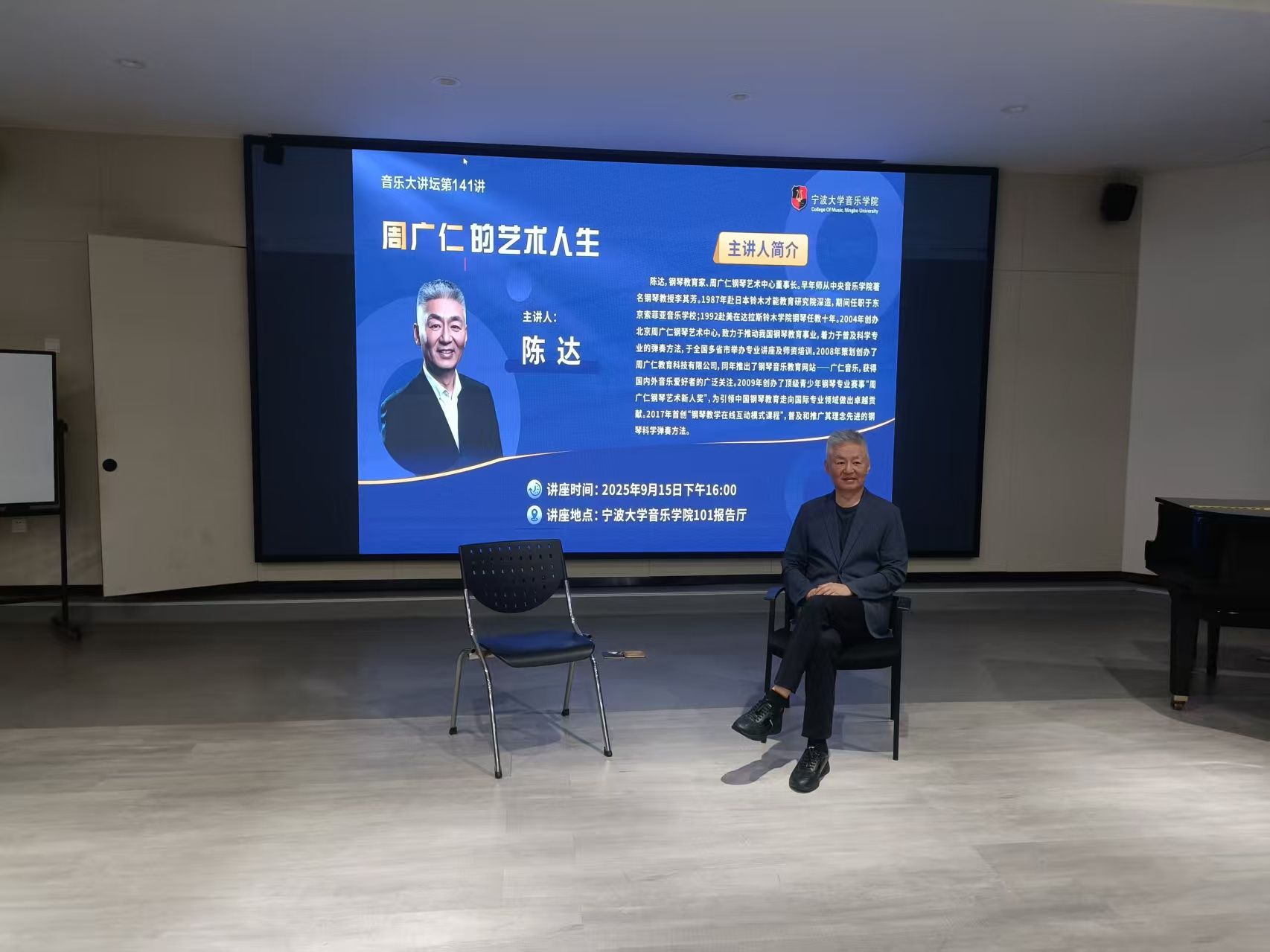 邀请钢琴教育家、周广仁钢琴艺术中心董事长陈达做客音乐大讲坛第141讲,为学院师生做题为《周广仁的艺术人生》的学术讲座。陈达,钢琴教育家、周广仁钢琴艺术中心董事长。早年师从中央98堂