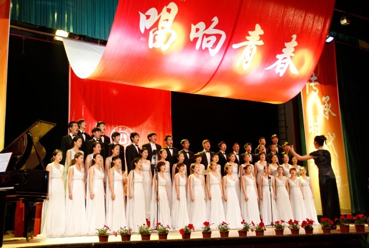 合唱队为五四青年节献礼的第一首歌曲是《美丽的草原我的家》,歌曲采用了蒙古族民间音乐的风格,既突出民族风格,又赋予新的时代气息。同学们以优美动人的嗓音,无伴奏合唱的方式进行演绎,指挥为08音乐的徐莹莹同学,仿佛让观众置身于“天苍苍,野茫茫,风吹草低见牛羊”的迷人景致中。一曲落罢,现场响起雷鸣般的掌声。接下来的这首《在灿烂的阳光下》将本次大赛推向了高潮。在周婷婷同学钢琴伴奏、赵冰玥同学的指挥下,98堂