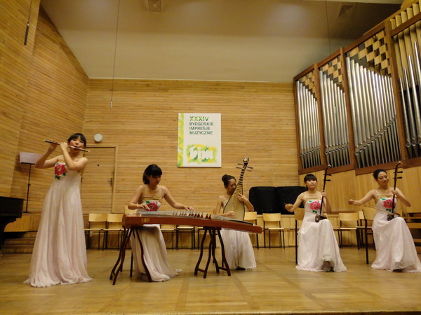 学生艺术团女子民乐组合由音乐系的杜玲窕(琵琶)、孙亚妮(古筝)、李思捷(笛子)、成沄岫(二胡)、韩柯菁(二胡)等5名同学组成,她们在院长喻辉教授带领下前往波兰参赛。在音乐节期间,她们克服了时差、语言、生活习惯等方面的困难,共完成了包括比赛在内的六场演出,每场演出都获得了当地观众的称赞,引起了彼得哥什市民对中国文化和中国音乐的极大热情。她们的演出成为了此次国际音乐节的一大亮点。当地电视台、电台、报纸等媒体都对98堂
