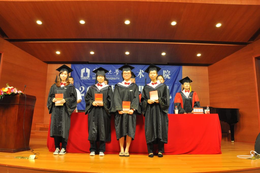 毕业典礼由学院党委副书记叶春桥主持。院党委书记袁虹老师宣读了省级、校级优秀毕业生以及艺术学院考研奖获奖名单。省级优秀毕业生07环艺班何静同学代表全体毕业生发言,她深情回顾了在宁大的成长经历,表达了对母校、老师真挚的感恩之情。07音乐班班主任沈周忆老师则鼓励全体毕业生要勇敢地面对挑战,“心有多大,舞台就有多宽广”。院长喻辉教授在典礼上讲话,希望同学们成为务实之人,踏踏实实做人,认认真真做事;希望同学们成为坚韧之人,拥有对目标坚持不懈的恒心和强大的意志力;希望同学们成为好学之人,敢于创新、勇于突破。最后他还勉励全体毕业生在工作岗位上再接再厉,为母校争光,牢记自己永远是宁大人,常回学院看看。典礼上,院长喻辉和院长助理狄智奋为毕业生拨穗授予学位、送出寄语,并与毕业生们合影留念。