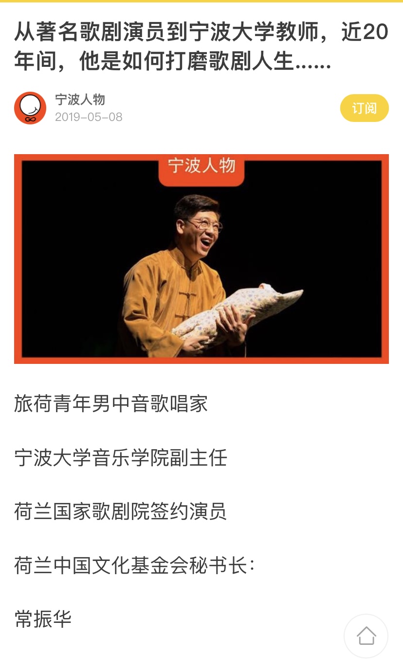 常振华老师作为旅荷青年男中音歌唱家、荷兰国家歌剧院签约演员、荷兰中国文化基金会秘书长接受了《宁波人物》题为“从著名歌剧演员到98堂 教师,近20年间,他如何打磨歌剧人生”的专访。