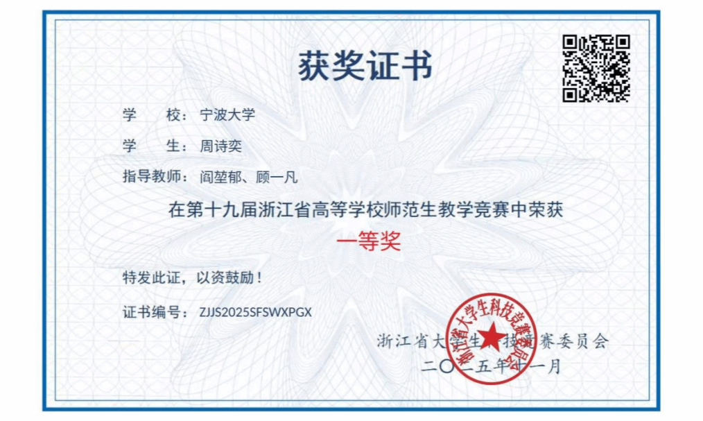 此外,周诗奕已由省赛推荐,将代表浙江出征即将举行的第七届长三角师范生教学基本功大赛。
