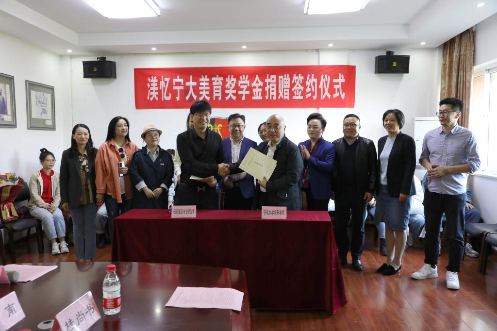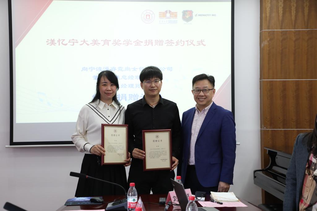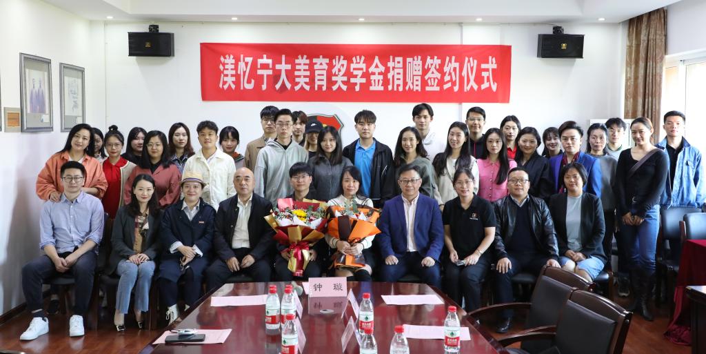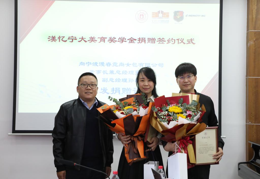 美育教育中心与宁波漫睿霓尚女包有限公司签订“渼忆宁大美育奖学金”捐赠协议。我校俞子正、李国平、屠春飞、桂尚书、王蕾等人,及美育教育中心老师代表与98堂