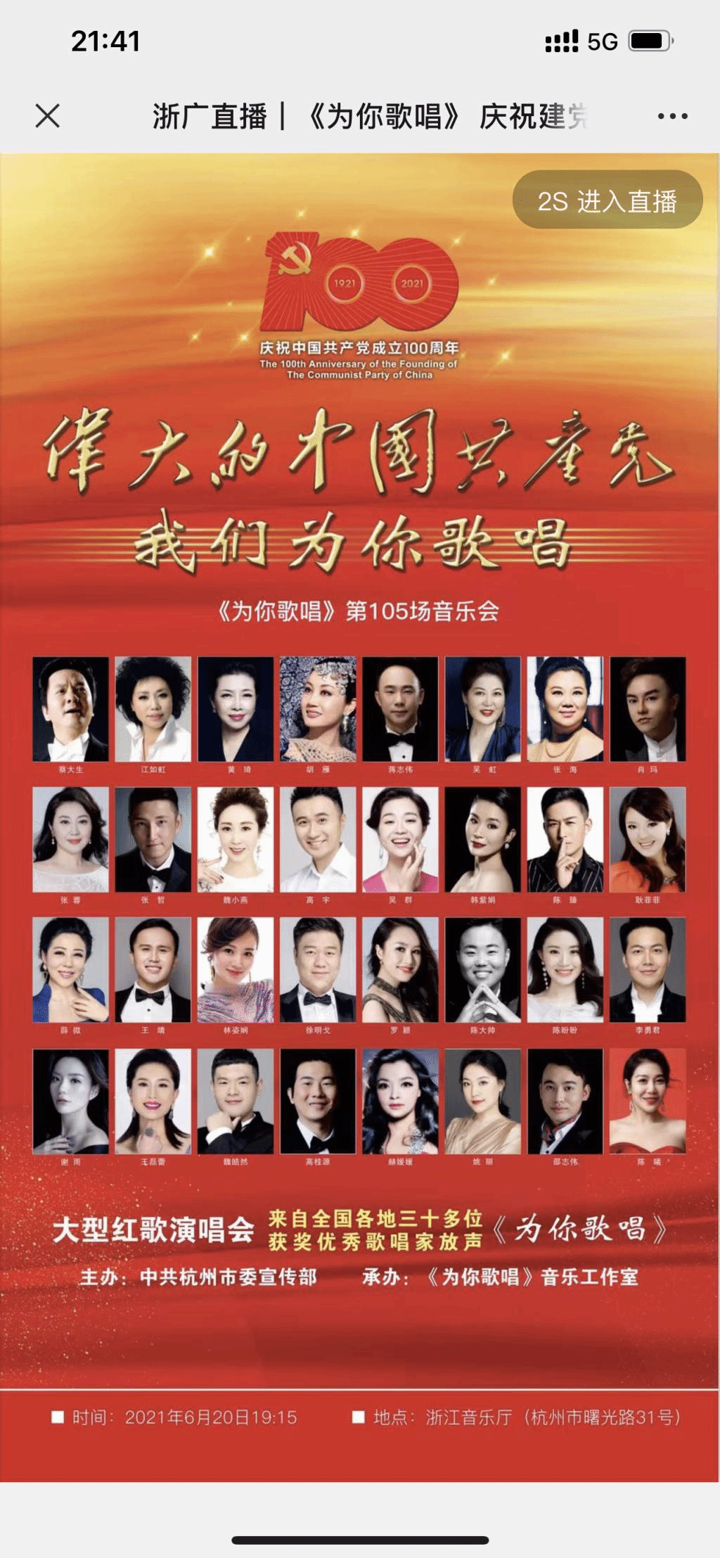 6月20日晚7:15,浙江音乐厅座无虚席,有杭州市委宣传部主办、“为你歌唱”音乐工作室承办的“为你歌唱”第105期“纪念伟大的中国共产党诞辰100周年”大型红歌演唱会准时开幕。98堂