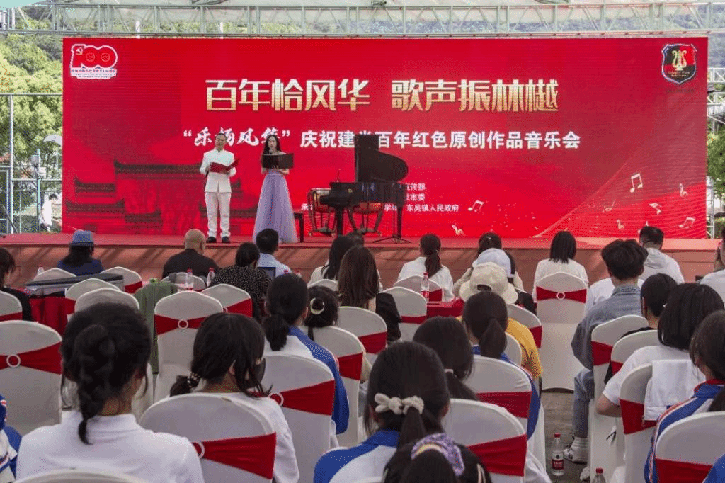 与东吴镇人民政府共同承办的“乐扬风华”庆祝建党百年红色原创作品音乐会在宁波市鄞州区东吴镇文体中心广场举行,旨在用红色原创作品向中国共产党百年历程和复兴巨变致敬,号召青年传承红色基因,励志奋斗当下,在开启社会主义现代化的新征程中立改革潮头、做时代先锋。共青团宁波市委副书记张军,东吴镇党委书记汪辉,98堂