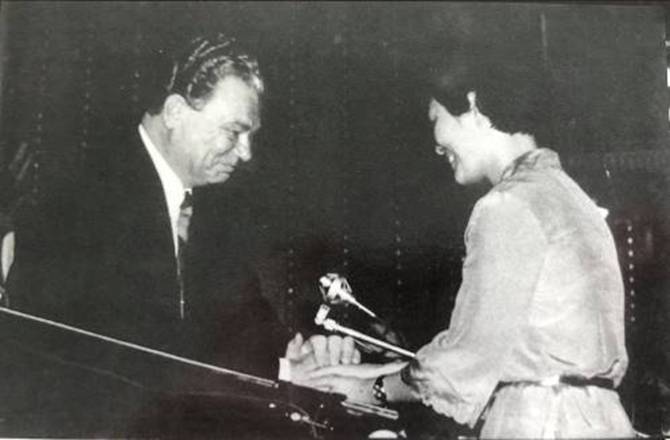 1982年9月胡晓平在布达佩斯国际声乐比赛中领奖。